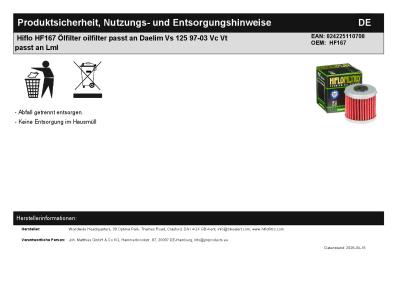 | Titel: | Hiflo HF167 Ölfilter oilfilter passt an Daelim Vs 125 97-03 Vc Vt passt an Lml |