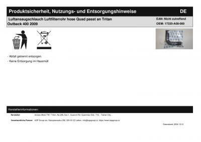 Titel: | Luftansaugschlauch Luftfilterrohr hose Quad passt an Tritan Outback 400 2009 |