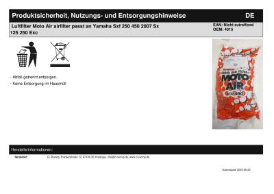 Titel: | Luftfilter Moto Air airfilter passt an Yamaha Sxf 250 450 2007 Sx 125 250 Exc |