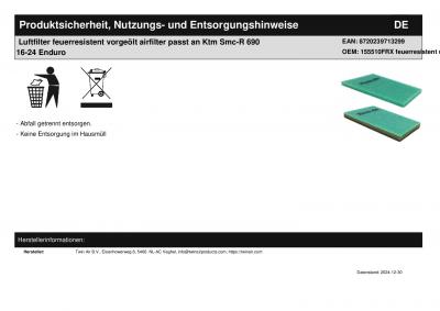 Titel: | Luftfilter feuerresistent vorgeölt airfilter passt an Ktm Smc-R 690 16-24 Enduro |
