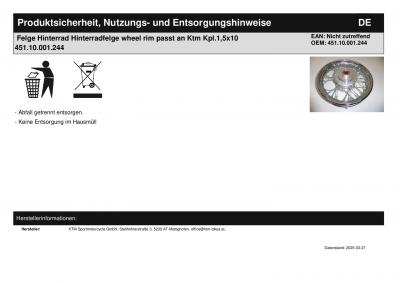 Felge Hinterrad Hinterradfelge wheel rim passt an Ktm Kpl.1,5x10 451.10.001.244