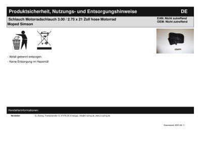 | Titel: | Schlauch Motorradschlauch 3.00 / 2.75 x 21 Zoll tube passt an Simson Motorrad |