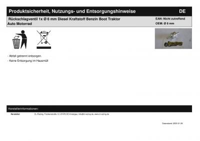 | Titel: | Rückschlagventil 1x Ø 6 mm Diesel Kraftstoff Benzin Boot Traktor Auto Motorrad |