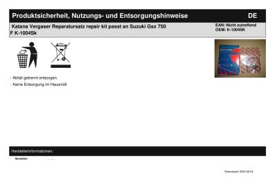 Titel: | Katana Vergaser Reparatursatz repair kit passt an Suzuki Gsx 750 F K-1004Sk |