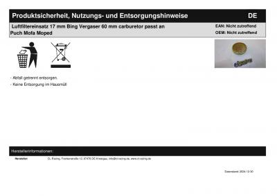 Luftfiltereinsatz 17 mm Bing Vergaser 60 mm carburetor passt an Puch Mofa Moped