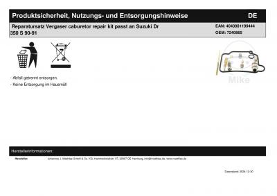 Titel: | Reparatursatz Vergaser caburetor repair kit passt an Suzuki Dr 350 S 90-91 |