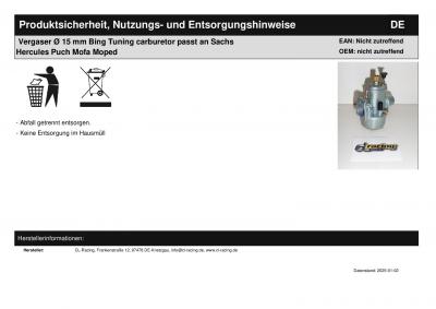 Titel: | Vergaser Ø 15 mm Bing Tuning carburetor passt an Sachs Hercules Puch Mofa Moped |