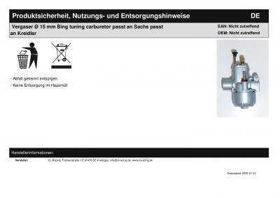 Titel: | Vergaser Ø 15 mm Bing tuning carburetor passt an Sachs passt an Kreidler |