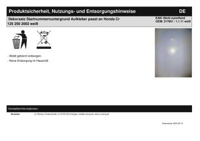 | Titel: | Dekorsatz Startnummernuntergrund Aufkleber passt an Honda Cr 125 250 2002 weiß |