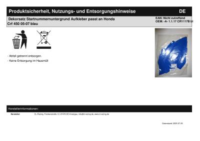 | Titel: | Dekorsatz Startnummernuntergrund Aufkleber passt an Honda Crf 450 05-07 blau |