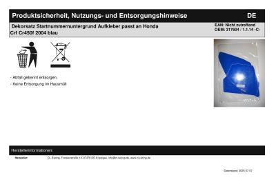| Titel: | Dekorsatz Startnummernuntergrund Aufkleber passt an Honda Crf Cr450f 2004 blau |