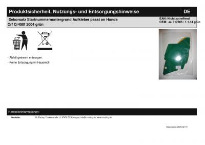 | Titel: | Dekorsatz Startnummernuntergrund Aufkleber passt an Honda Crf Cr450f 2004 grün |