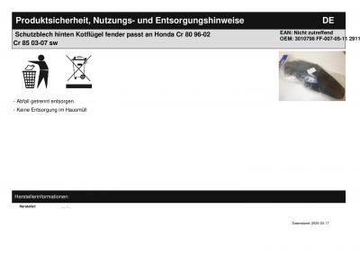 | Titel: | Schutzblech hinten Kotflügel fender passt an Honda Cr 80 96-02 Cr 85 03-07 sw |