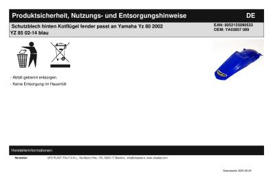 | Titel: | Schutzblech hinten Kotflügel fender passt an Yamaha Yz 80 2002 YZ 85 02-14 blau |