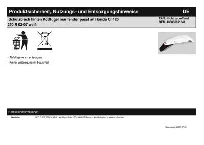 Schutzblech hinten Kotflügel rear fender passt an Honda Cr 125 250 R 02-07 weiß