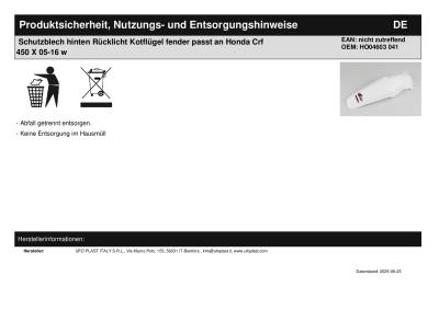 Titel: | Schutzblech hinten Rücklicht Kotflügel fender passt an Honda Crf 450 X 05-16 w |