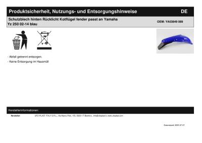 | Titel: | Schutzblech hinten Rücklicht Kotflügel fender passt an Yamaha Yz 250 02-14 blau |