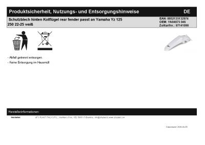 | Titel: | Schutzblech hinten Kotflügel rear fender passt an Yamaha Yz 125 250 22-25 weiß |