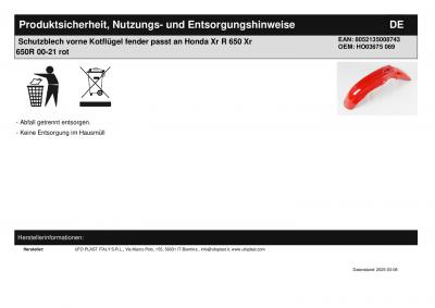| Titel: | Schutzblech vorne Kotflügel fender passt an Honda Xr R 650 Xr 650R 00-25 rot |