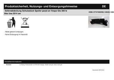 Titel: | Seitenabdeckung Schutzstück Spoiler passt an Vespa Gts 300 Ie Abs Usa 2014 sw |