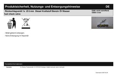 | Titel: | Rückschlagventil Ø 6 mm Diesel Kraftstoff Benzin Öl Wasser fuel check valve |